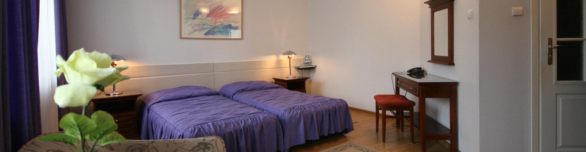 Do Państwa dyspozycji są 24 klimatyzowane pokoje z własną łazienką, 5 pokoi jednoosobowych, 13 pokoi dwuosobowych typu twin, oraz 6 pokoi dwuosobowych z dużym łóżkiem małżeńskim. Wszystkie pokoje wyposażone są w łazienki z wanną lub natryskiem, suszarki do włosów, TV, telefon, bezprzewodowy bezpłatny dostęp do internetu (WiFi). Pokoje urządzone są w komfortowym i eleganckim stylu, posiadają jedno łóżko małżeńskie lub 2 pojedyncze łóżka. Na życzenie Gości dostępne są: żelazko i deska do prasowania, czajnik.